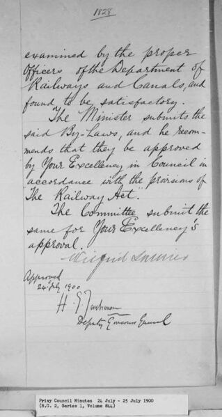 | current | 16:23, 22 September 2021 | 471 × 885 (67 KB) | Sarah Taylor (talk | contribs) | '''Courtesy Library and Archives Canada<br> Dominion Atlantic Railway - Min. R. and C. [Minister of Railways and Canals] 1900/07/24<br> Hierarchical level: File<br> Order in Council number: 1900-1828<br> Page 4<br> Date introduced: 1900-07-24<br> Date considered: 1900-07-24<br> Date approved: 1900-07-24<br> Reference: RG2, Privy Council Office, Series A-1-a. For Order in Council see volume 810, Reel C-3783 Access Code 90<br> Type of material: Textual records<br> Found in: Archives / Orders-in... |