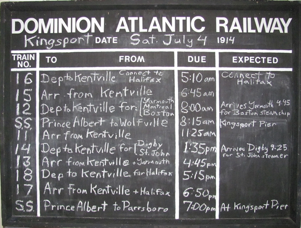 A 102 years ago today, the tiny village of Kingsport, Nova Scotia had this remarkable level of public transport - eight trains a day! Overnight connections right from the village station to Boston or Montreal! Plus a ferry across the Minas Basin. There is probably no community in Nova Scotia, outside of Halifax, with this level of public transport today. This is a replica station board which I made and chaulked up with info taken from the 1914 time table of the Dominion Atlantic Railway at the Nova Scotia Archives: https://novascotia.ca/archives/Tourism/ ... asp?ID=362