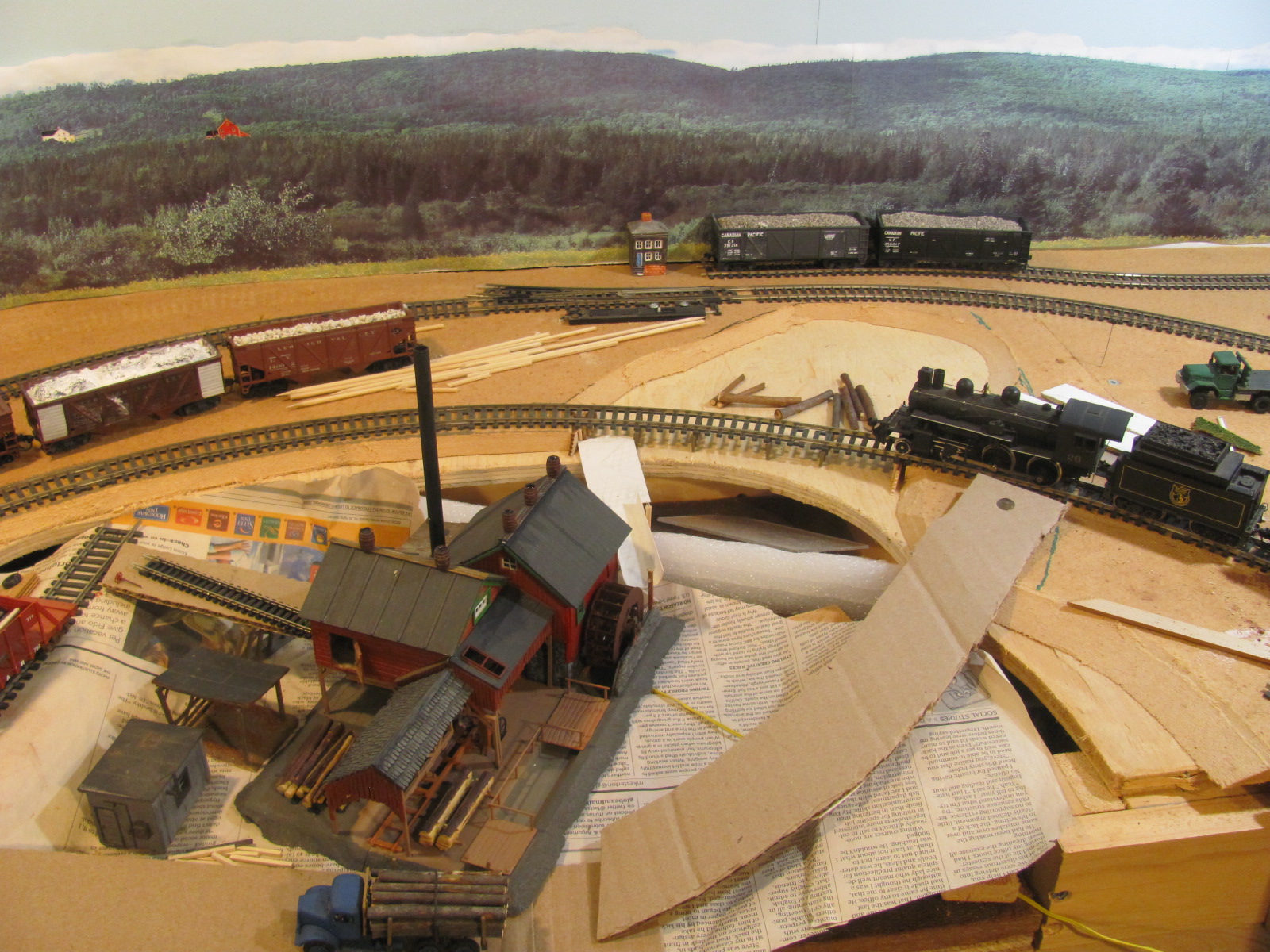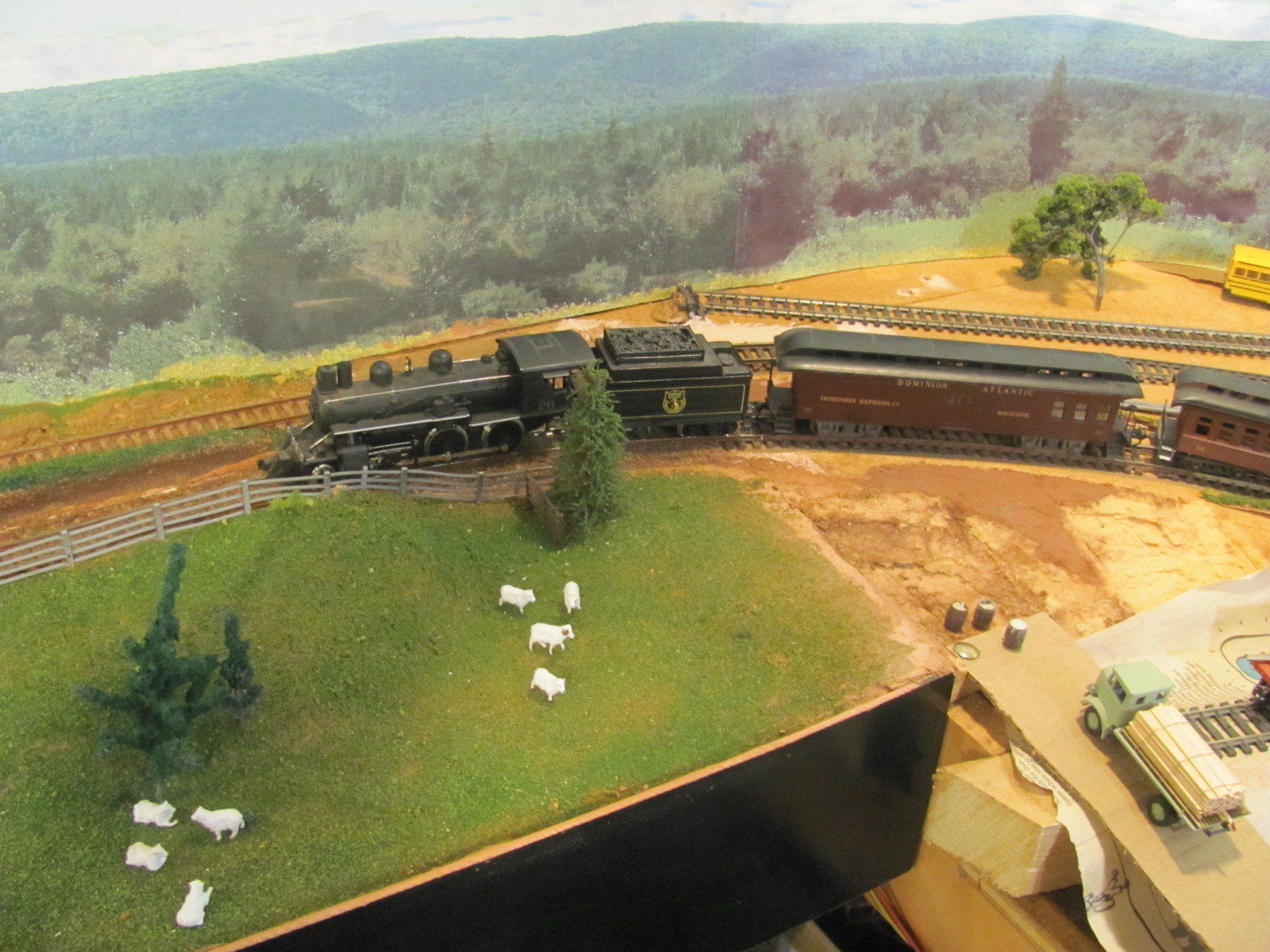 Here's some photos of progress on my layout in 2014. I am modelling the CVR from Kentville to Kingsport. My trackwork is more or less done, although there are some sidings to add and maybe a staging track behind the backdrop. My scenery is slowly creeping along with Kentville mostly complete. I have also started on the big Kingsport wharf.