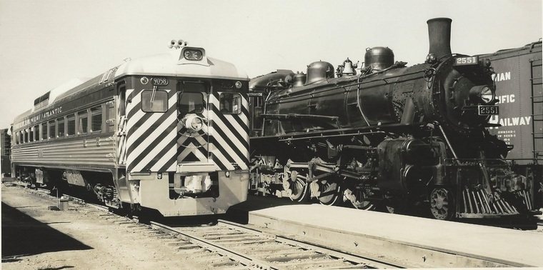 14:55, 23 October 2019Thumbnail for version as of 14:55, 23 October 2019760 × 378 (114 KB)Sarah Taylor (talk | contribs)''Courtesy of Old Time Trains''<br> The new and the old side by side. The Dayliner appears to be on tour likely at Kentville.<br> Note extra (white) flag on front of 9058. Also, ENTRANCE sign at right rear of Car.<br> Photograph Steve Morris Collec...