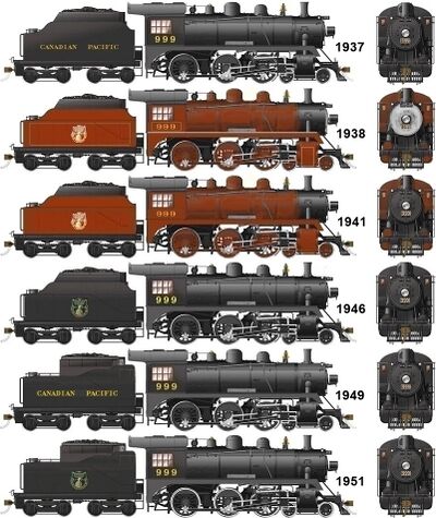 | + | The DAR initially used No. 999 on passenger runs to Halifax, but with the arrival of larger and more powerful [[:Category:4-6-2|4-6-2 Pacific locomotives]], No. 999 and the other D10s on the DAR were used on the line's mainline freight service as well as hauling heavy [[:Category:Gypsum Trains|gypsum trains]]. No. 999 arrived with a CPR paint scheme and lettering but was painted in DAR's Land of Evangeline red paint scheme with a silver smoke box in 1938.<ref>"New color scheme recently adopted for the front end of locomotives" [[Bishop, George|George Bishop]], [[:Category: The Advertiser|''Kentville Advertiser'']] Oct. 27, 1938.</ref> Although named "Fronsac", no name plate appears to have been affixed to the locomotive, based on known photographs. It is listed as a D.A.R. unit in both 1941<ref>[[19410101-MP14|1941 Canadian Pacific Railway Summary Of Equipment, Form M.P. 14 - January 1, 1941]], page 15.</ref> and 1947.<ref>[[Omer Lavallée]], ''[[Canadian Pacific Railway Diagrams and Data (Steam Locomotives)]], page 3.''</ref> The locomotive was repainted in black with CPR lettering during World War II. The Evangeline herald was returned to the black paint scheme about 1950. A replacement tender was added about 1949 and the streamlined skirting was cut down. The locomotive was reassigned to the London, Ontario area in July 1953.<ref>Ness, page 76</ref> In Ontario service, a cross compound air compressor replaced the single cylinder compressor and the triangular number board was replaced with a simple flat number board. Near the end of its career the cowcatcher style pilot was replaced with a switching pilot. | ||