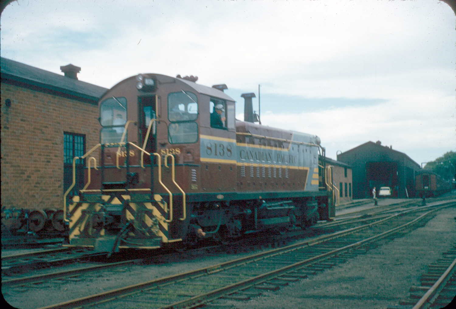 Original Kodachrome Slide, August 1959, CPR No. 8138 next to car shops, Pontiac Inspection car in doorway of shops, Kentville, NS.