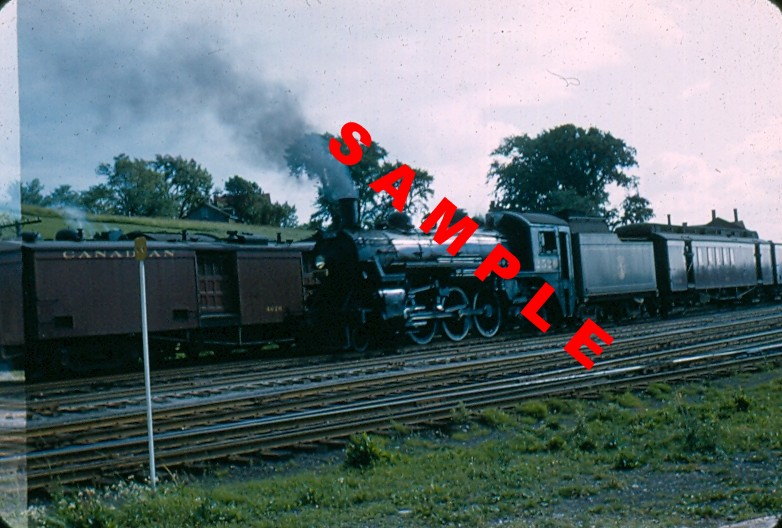 Original Kodachrome Slide, July 3, 1954, Dominion Atlantic Railway No. 2526, shunting in reverse Train No. 98 past Fruit Express car No. 4626 preparing to leave Windsor for Halifax in late afternoon.