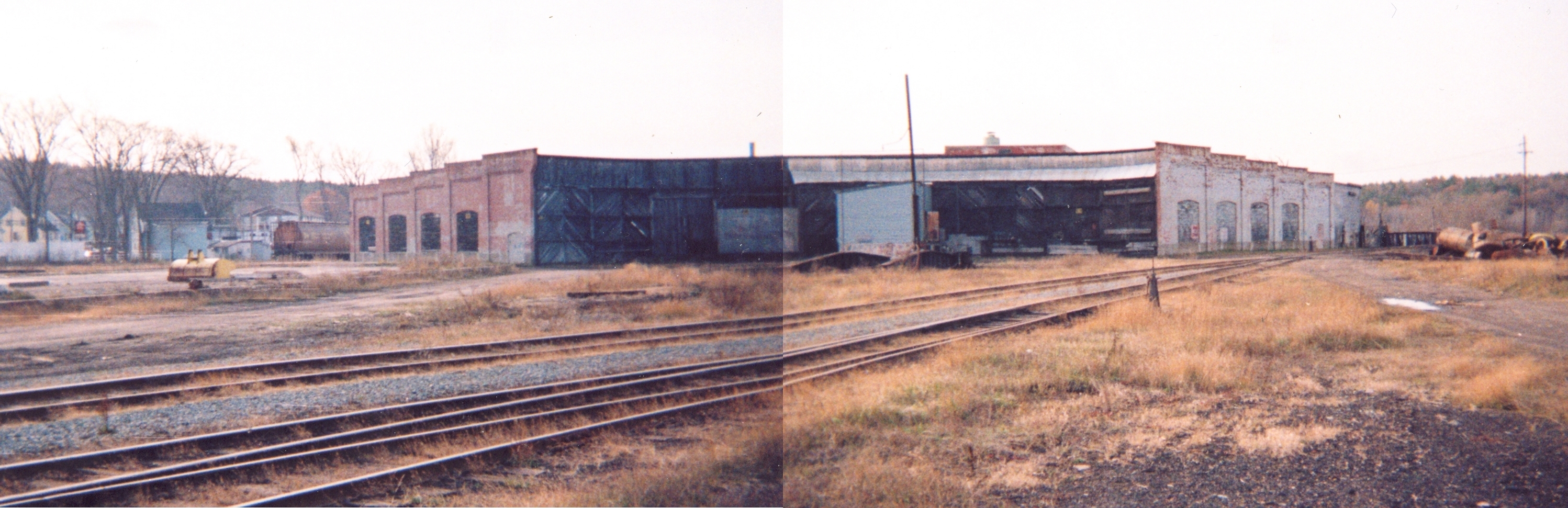 Composite panoramic photograph of the Kentville Roundhouse, showing the east side with stall doors and the south and north walls, along with the turntable with approach tracks removed, photographed by Tom Tupper, 1990. Note the foundation of the machine shop to the right and the ladder track leading the the Cornwallis River Bridge and CVR branch in the foreground.