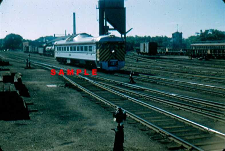 DAR Dayliner, No. 9058 or 9059 crossing Kentville Railyard to arrive at Kentville with the Kentville Coaling Tower and Kentville Water Tower in the background, 1956.