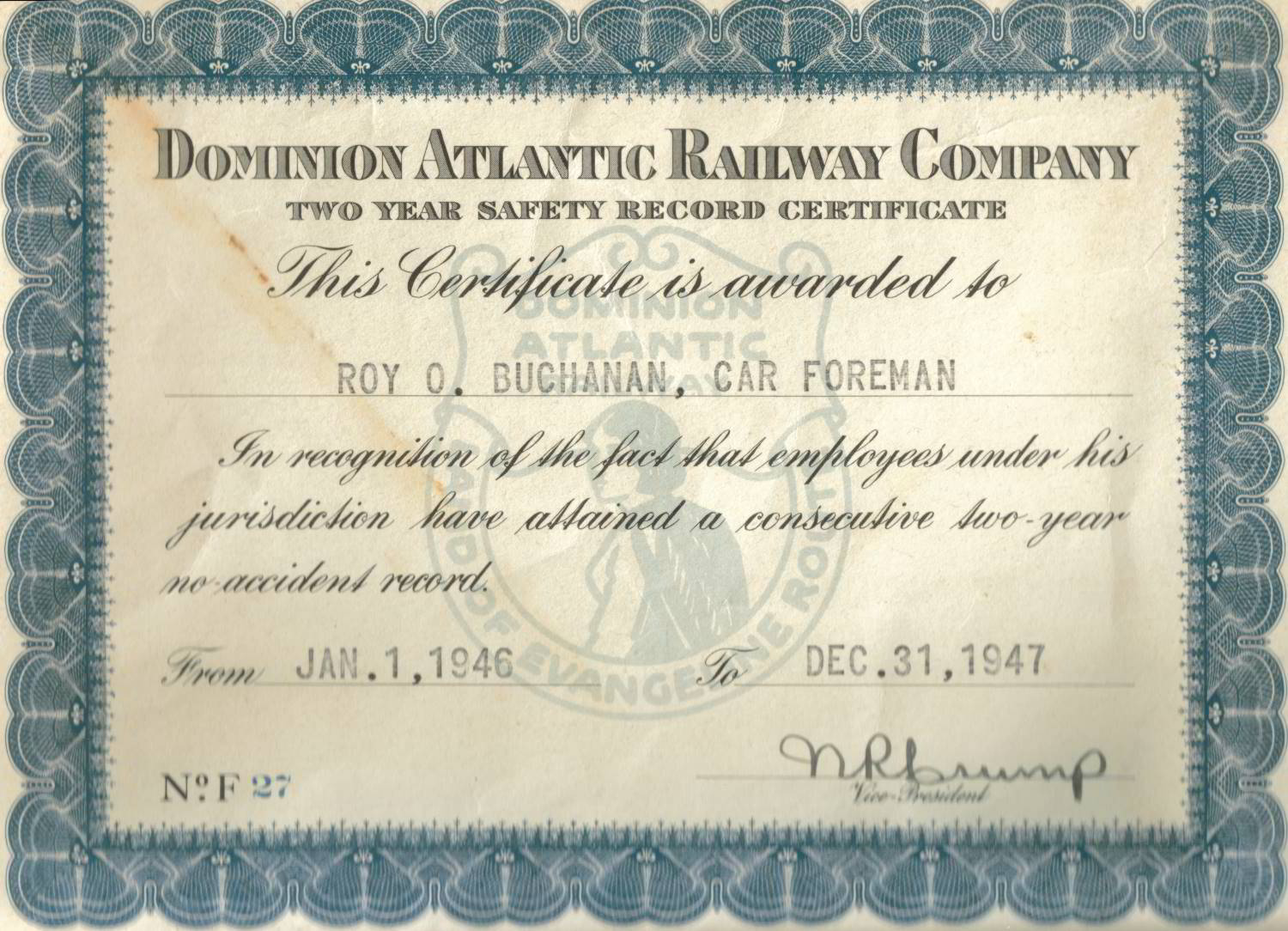 A two year safety certificate issued to Car Shop foreman Roy Buchanan in 1949. A photo was also taken at that presentation with all the car shop employees in Roy's shop.
