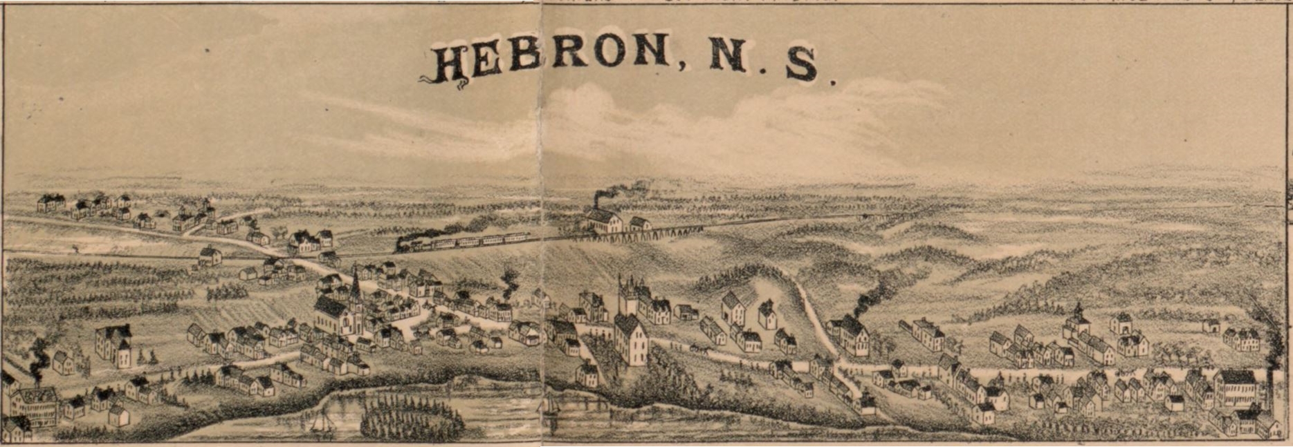 Revision as of 19:37, 8 April 2022 by Dan Conlin (talk | contribs) (Bird's Eve View of Yarmouth Nova Scotia 1889: Detail of Hebron), 1889. Nova Scotia Archives, Map Collection: 3.1.1. / negative O/S N-74)