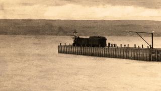 Detail, Kingsport Wharf, from the east, at high tide with a DAR locomotive at the end of the wharf with a boxcar and the combine car No. 32 "Daphne", detail of Kingsport Wharf Photo, photographed by Edson Graham, circa 1920.
