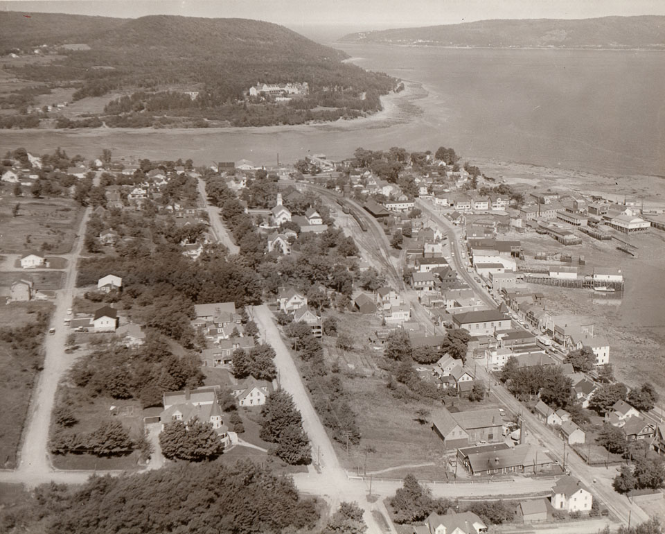 Aerial view of Digby from south showing the Digby Station, Digby Railyard, the Digby Pines and the spur to the Digby Wharf, circa late 1950s.