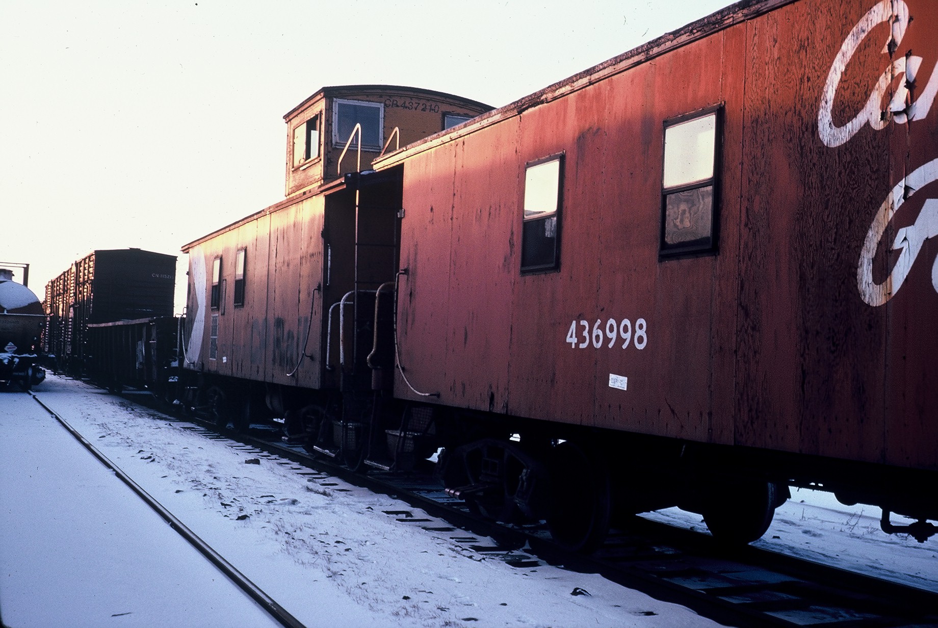 These vans No. 437210 and No. 436998 are in the Truro Yard in February 1982, being sent back to Montreal. The cabooses were damaged in the yard and were held until repaired. All the wooden cabooses were sent back at this time. There were enough steel cabooses sent to Kentville to cover for the wooden ones.