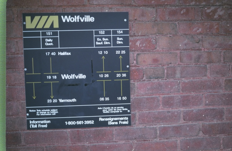 VIA Rail sign on Wolfville Station on August 14, 1988.