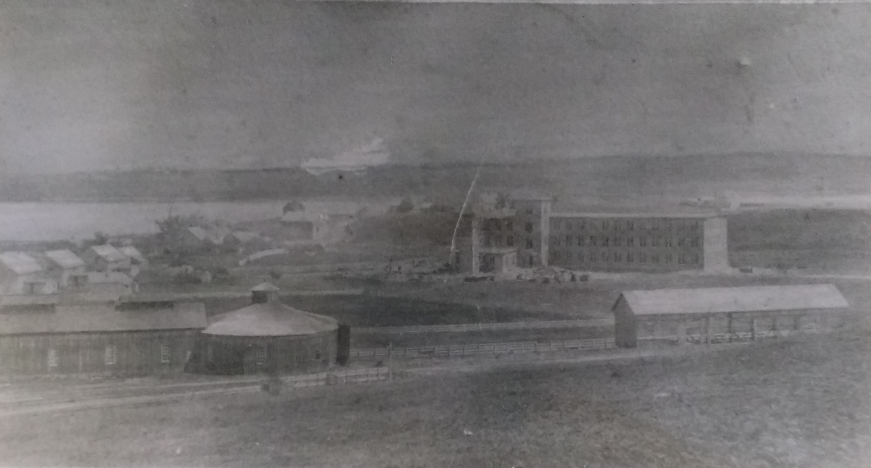 Photograph from the West Hants Historical Society collection showing the Windsor Enginehouse and the circular structure covering the turntable, with the Windsor Cotton Mill in the background. Date is not recorded, but the Windsor Cotton Mill (later Windsor Wear) appears to be nearing completion, suggesting circa 1884.[1]
