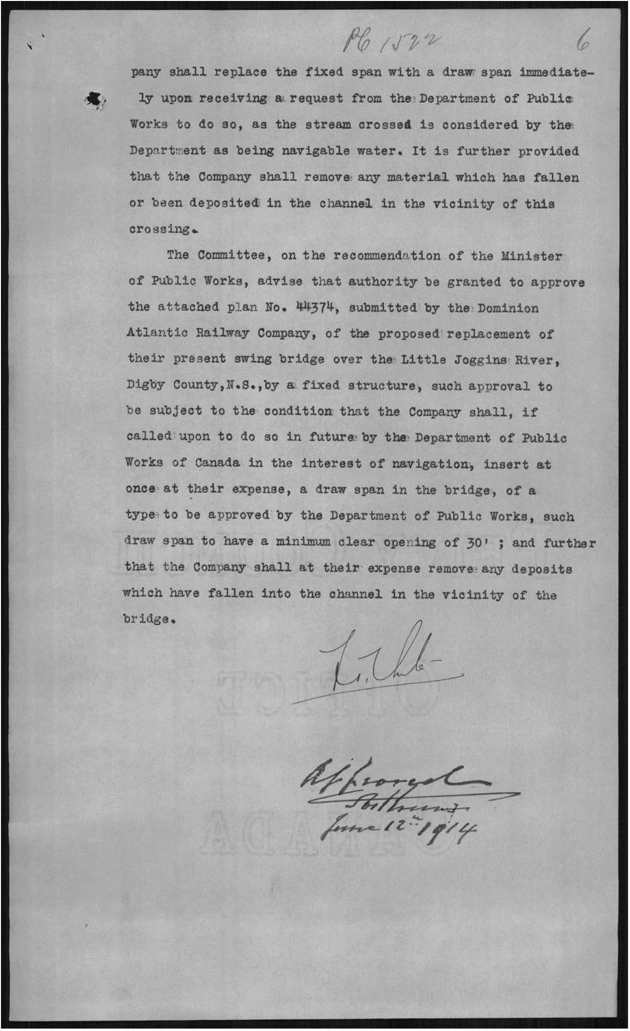 Title: Bridge Dominion Atlantic Ry. [Railway] over Little Jogging River, N. S. [Nova Scotia] - Approval of fixed instead of draw span - M. P. W. [Minister of Public Works] 1914/05/27