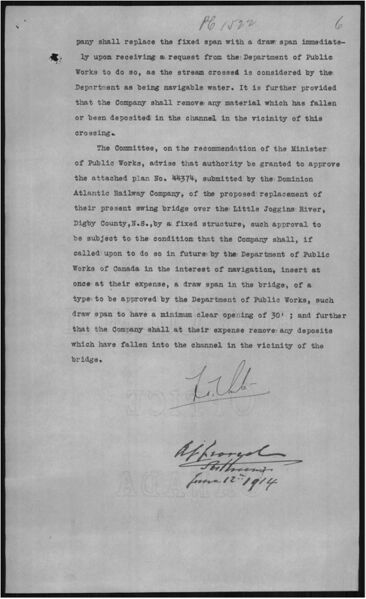 | current | 09:30, 14 October 2021 | 1,296 × 2,120 (752 KB) | Sarah Taylor (talk | contribs) | '''Courtesy of Library and Archives Canada<br> Title: Bridge Dominion Atlantic Ry. [Railway] over Little Jogging River, N. S. [Nova Scotia] - Approval of fixed instead of draw span - M. P. W. [Minister of Public Works] 1914/05/27<br> Page: 2<br> Hierarchical level: File<br> Order in Council number: 1914-1522<br> Date introduced:1914-06-09<br> Date considered:1914-06-11<br> Date approved:1914-06-12<br> Reference: RG2, Privy Council Office, Series A-1-a. For Order in Council see volume 1091, Ac... |
