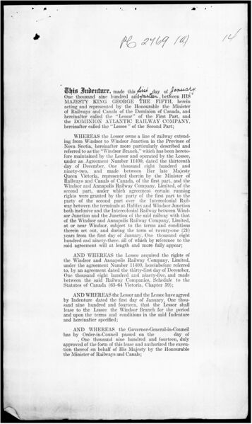 Title: Dominion Atlantic Ry. [Railway] - Approval lease from the Govt. [Government] of the Windsor Branch Ry. [Railway] - Min. R. and C. [Minister of Railways and Canals] 1914/10/31