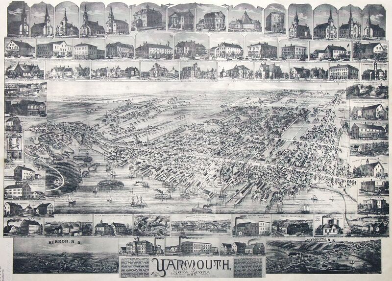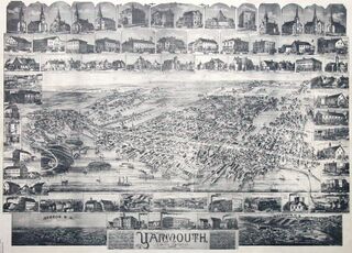 Bird's Eve View of Yarmouth Nova Scotia 1889 with the town of Yarmouth including the Yarmouth Station and the Yarmouth Enginehouse at centre left; the Yarmouth Duck and Canvas Company and inset views of Hebron and Weymouth.