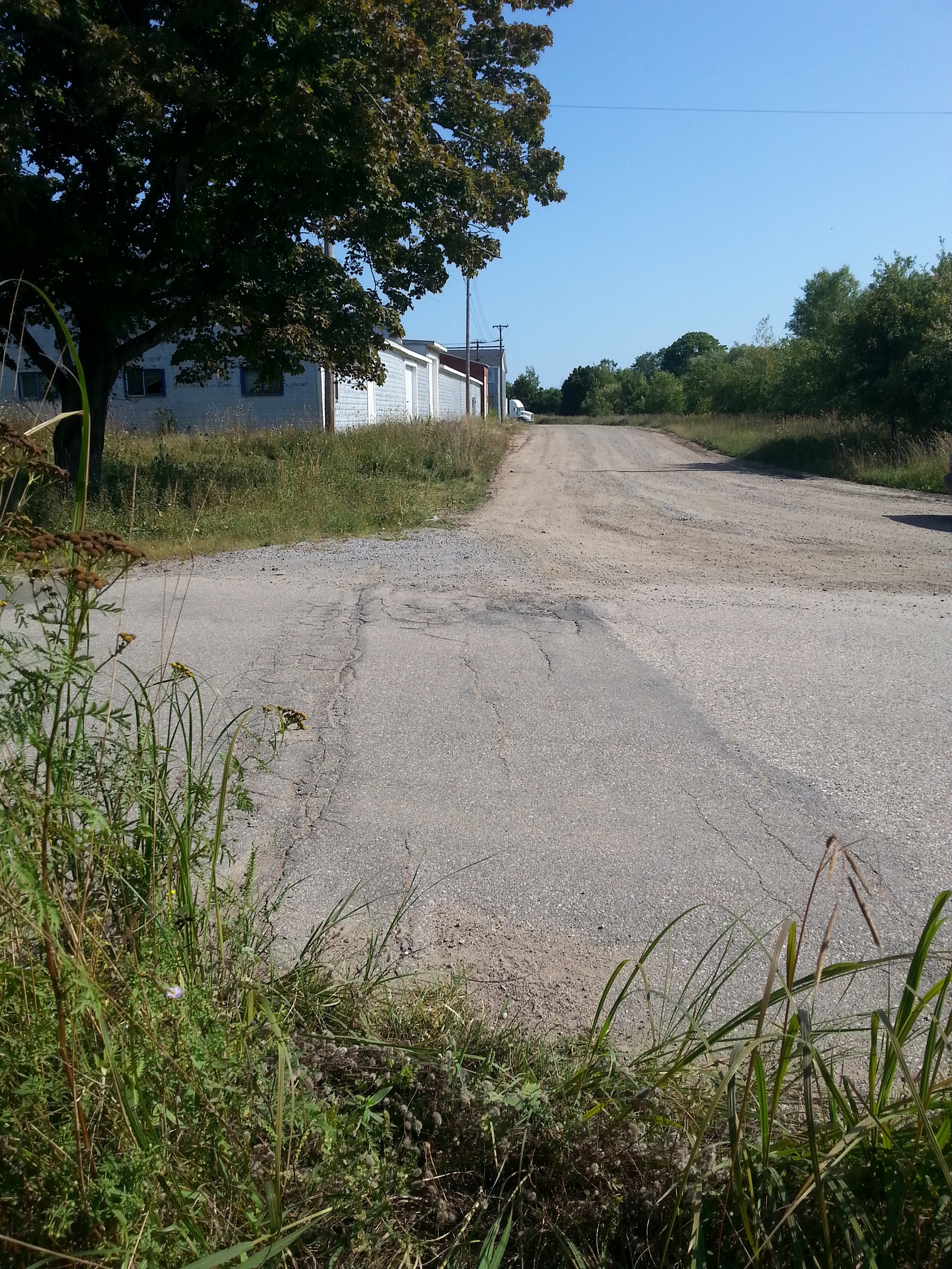 The former Farmer's margarine plant in Middleton is in the background and Victoria St. is in the foreground. The rail has been paved over but has since become exposed. The last train across these tracks was on March 20, 1990.