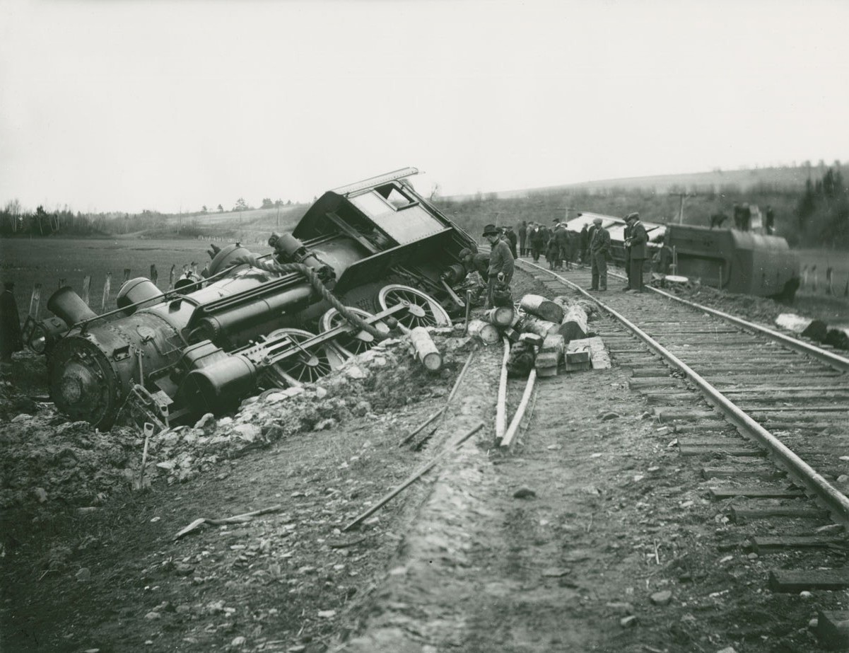 Wrecking crew prepares to lift derailed Locomotive No. 33 as baggage and express cars have been dragged off track to clear line near Hantsport, photographed by Arthur Edward Cornwall, April 5, 1919.