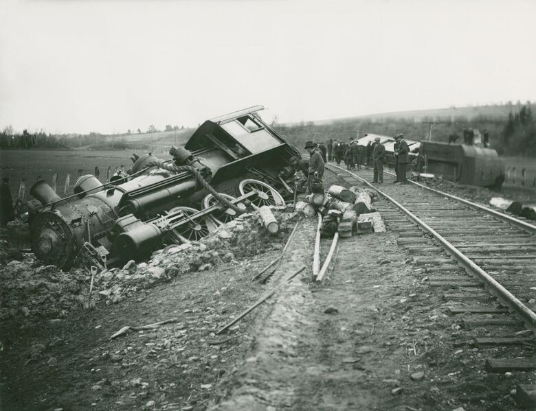 | current | 09:44, 13 December 2025 | 1,201 × 923 (238 KB) | Dan Conlin (talk | contribs) | Locomotive No. 33 derailed with baggage and express cars tracked off track to clear line near Hantsport, photographed by Arthur Edward Cornwall, April 5, 1919. [https://archives.novascotia.ca/alexander/archives/?ID=13 Zoomable version of image of Nova Scotia Archives site] Date: 5 April 1919 Photographer: A.E. Cornwall Reference no.: A.E. Cornwall Nova Scotia Archives 1984-497 number 13 / negative: N-2166 Category:Nova Scotia Archives Category:Train Wrecks |