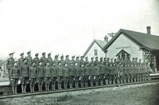 Photograph from the West Hants Historical Society collection showing recruits of the 85th Battalion forming up at the Hantsport Station with the Sandford apple warehouse in the background, circa 1915-1916.