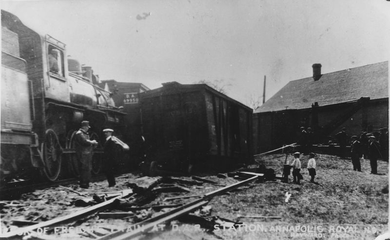 Derailment in Annapolis Royal Railyard on May 7, 1922. Visible are the Annapolis Royal Freight Shed, boxcar No. 69950, a Grand Trunk boxcar, a DAR steam wrecking crane, and an unidentified locomotive.