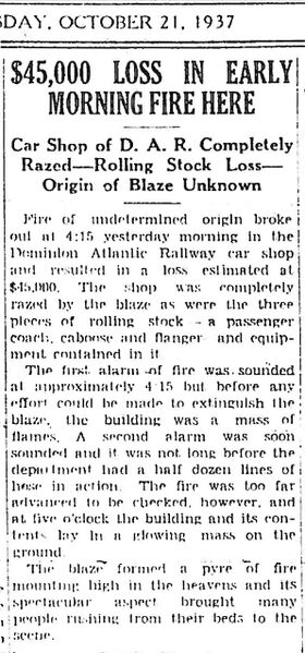 News article about the Oct. 20, 1937 destruction by fire of the Kentville Car Shop in the The Advertiser, Kentville, Oct. 21, 1937, p.1.