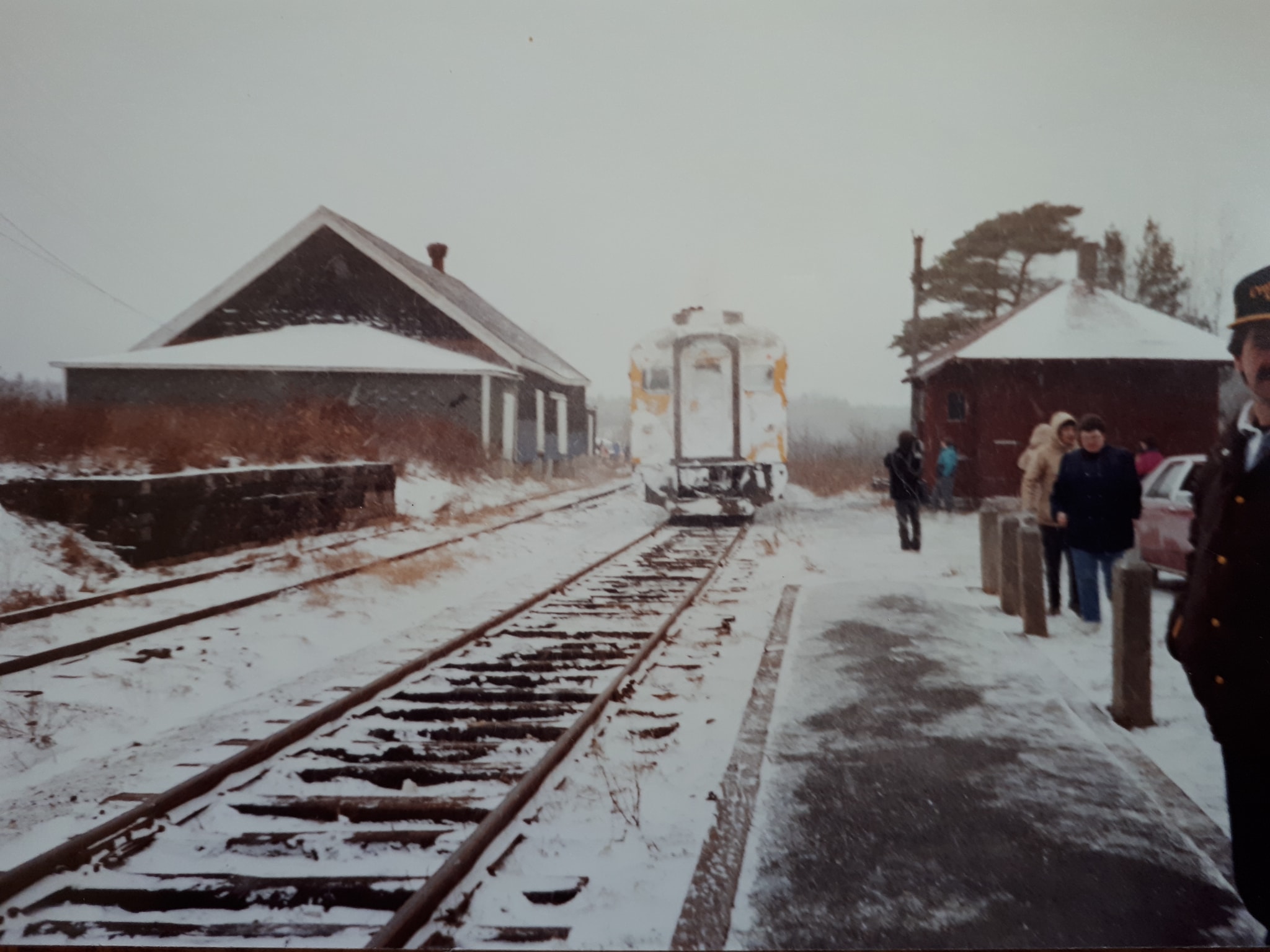 The DAR's dayliner leaves Meteghan Station for the final time on the last eastbound, Yarmouth to Halifax passenger run, with snow-covered RDC No. 6147 vanishing into the east, photographed by Angelina Blinn, January 14, 1990.