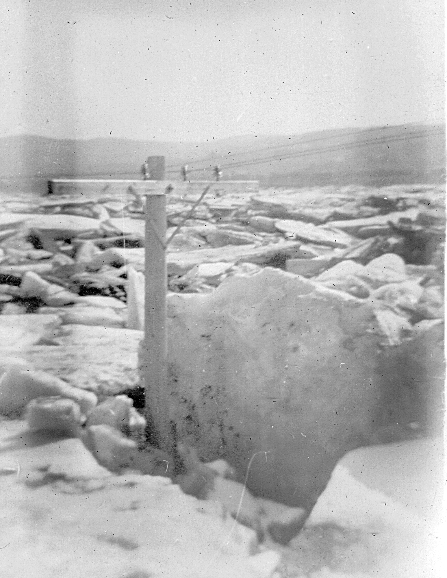 Photograph titled "On line of railway" showing a DAR telegraph pole at Bridgetown buried in large ice floes ice up to the cross arm during the March 14, 1920 ice jam at Bridgetown. Image by unknown local photographer from album about the flood from the Chris Gertridge's Collection.