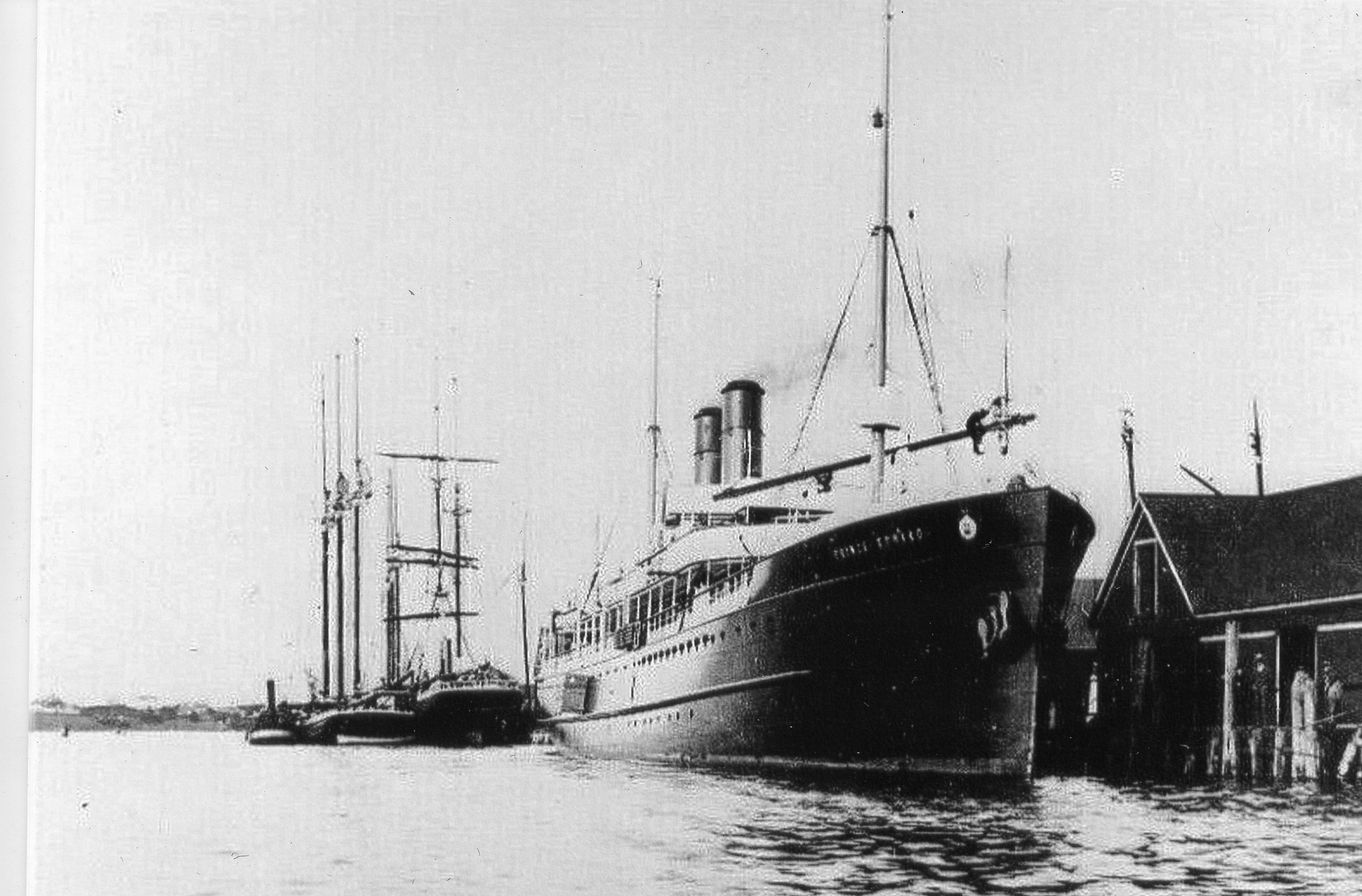 The DAR's SS Prince Edward in Yarmouth at the DAR's Yarmouth Wharf with a square rigger, two schooners and a tug in the background. Date and photographer unknown. Probably taken soon after the steamer arrived in service in 1897.