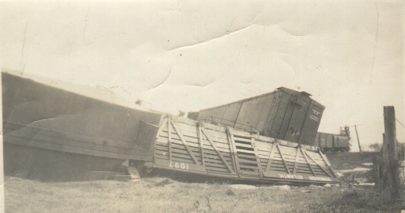 Postcard of DAR stock car No. 1097 in a train wreck sometime prior to 1935, supplied by Jim Taylor. Note also damaged refrigerator car to left with ice hatches knocked open.