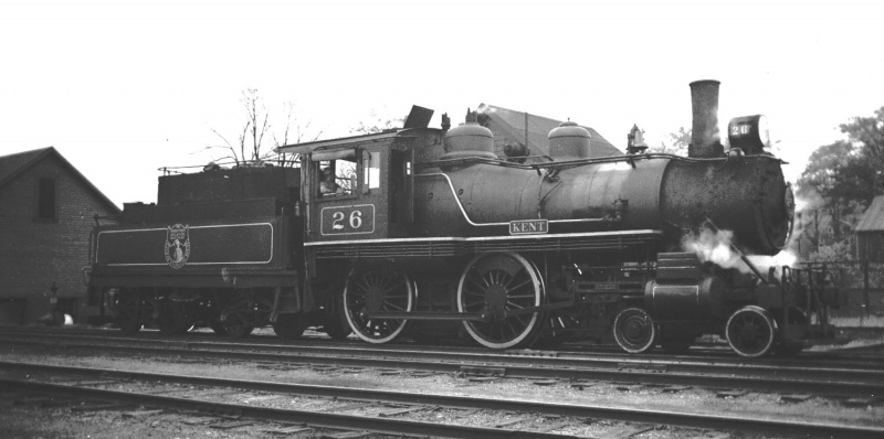 No. 26 "Kent" photographed at Kentville immediately behind the Kentville Station, circa 1937. The British Canadian fruit warehouse is to the left and the DAR tennis courts are to the right. Note the switching pilot which has replaced the road "cowcatcher pilot".