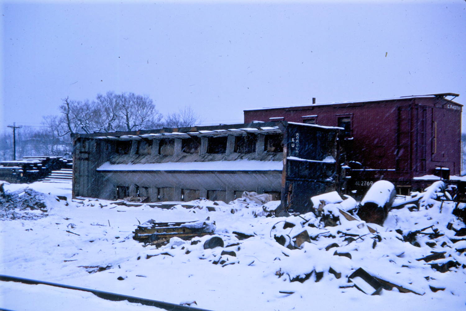 Wooden Gypsum car No. 350505 being scrapped at Kentville Railyard on April 3, 1964. Tool car No. 402769 can be seen behind.