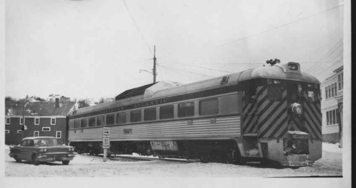 DESCRIPTION: The Dominion Atlantic on the train tracks in town; a car (a 1958 Pontiac) is parked along side of it
