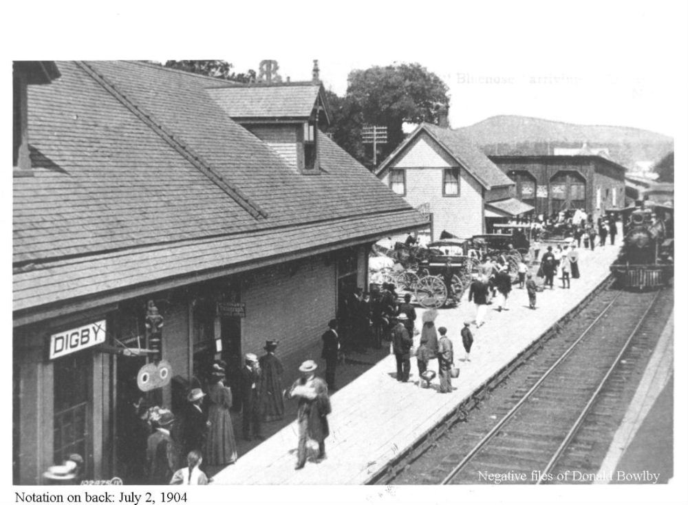 Digby Station, Looking north (probably from the top of a box car) showing both the WCR station in the foreground; the enginehouse in the background and the Digby Station Restaurant in between.[1] This photo was colourized and made into a popular postcard '"Bluenose" arriving at Digby, N.S.', one version which has a July 2, 1904 post mark.