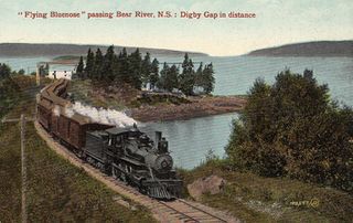 Colourized postcard postcard showing the Flying Bluenose heading east at the Bear River curve.