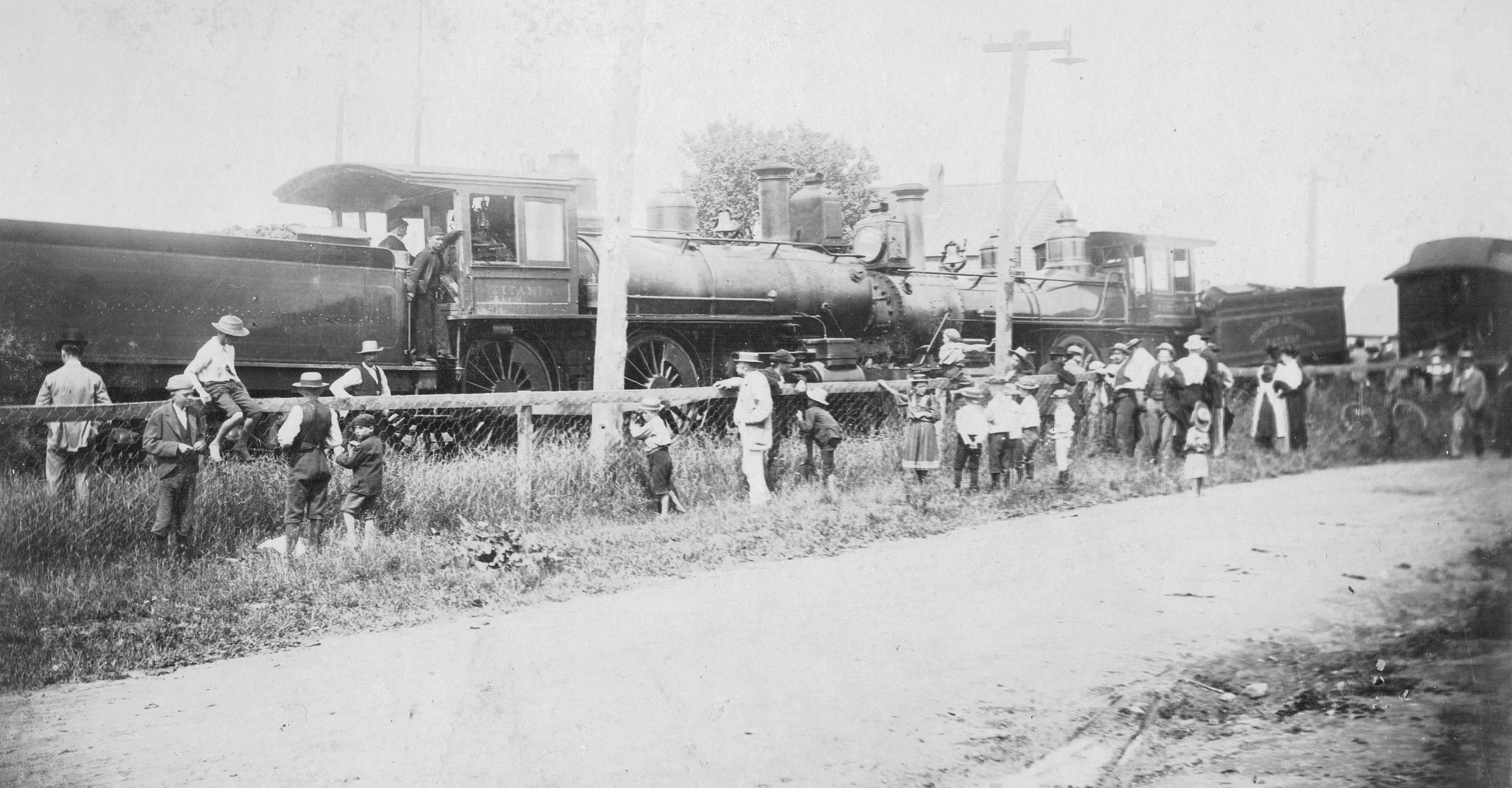 | current | 19:32, 1 September 2021 | 3,927 × 2,048 (2.83 MB) | Dan Conlin (talk | contribs) | == Summary == View from the south of the collision in Wolfville July 14, 1896, between the westbound Flying Bluenose pulled by Locomotive No. 21 "Fortuna" on the left and an eastbound freight, pulled by Locomotive No. 20 "Titania" on the right. They collided at the level crossing by the Wolfville Wharves, just east of the Wolfville Station. Fortunately there was only one minor injury and the Flying Bluenose resumed its trip two hours later.<ref>"The Col... |