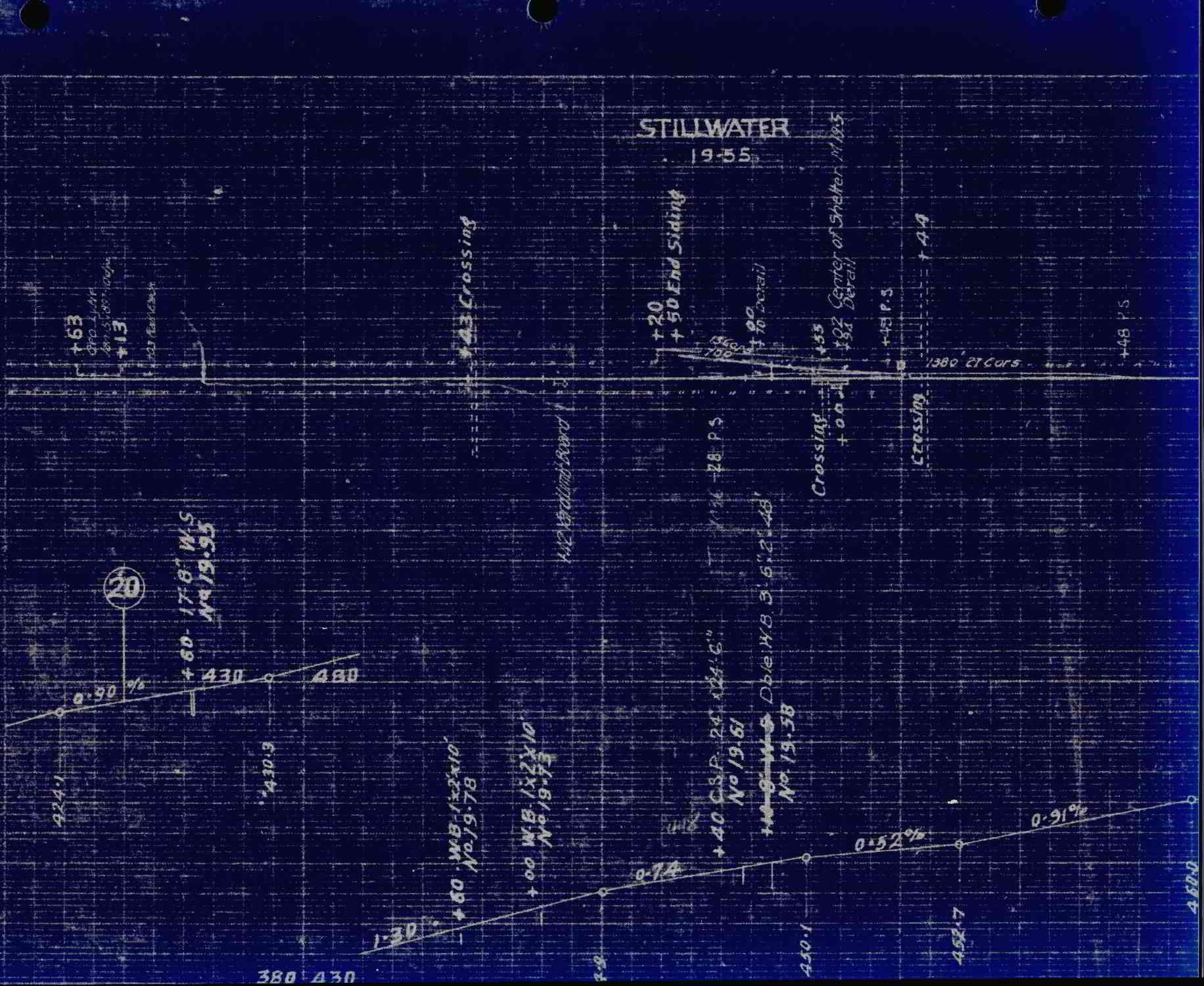 A clip of the March 18, 1918 C.P.R. track profile drawing showing Stillwater. The orientation of the track is west to the left (looking from the south).