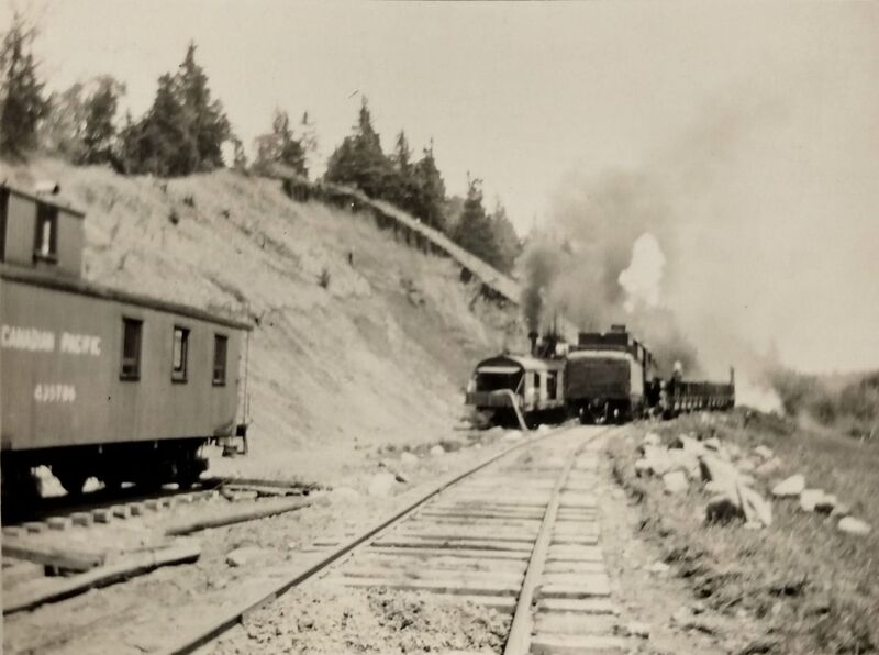 DAR steam shovel loading a ballast train with DAR Van No. 435786 serving as pit office at the Round Hill Ballast Pit, 1935. Note that the van, a rare three window CPR van, now sports CPR lettering after years of being lettered for the DAR.