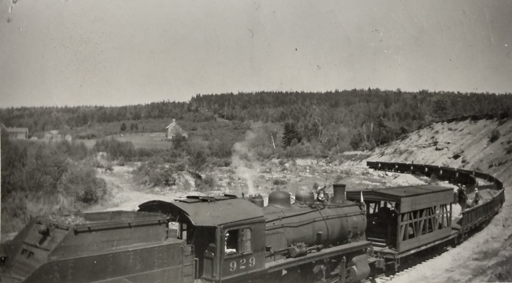 The Round Hill Ballast Pit with locomotive No. 929 with a train of drop-side ballast cars and a Lidgerwood Rapid Unloader, circa 1950-1956.