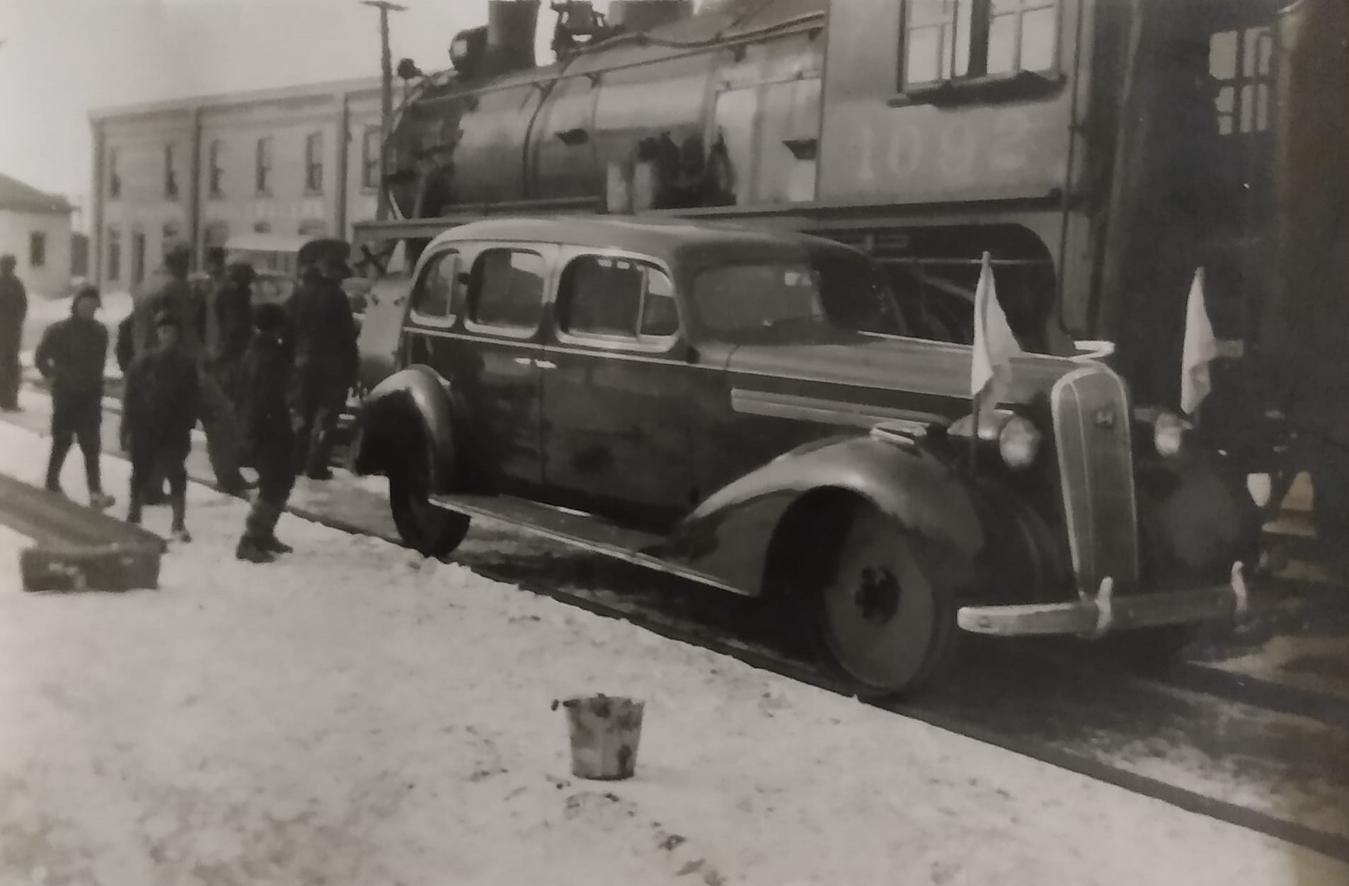 DAR Inspection Car at Windsor, a 1938 Maclaughlin Buick with Dominion Atlantic locomotive No. 1092 in background, circa 1940s, shortly after No. 1092's arrival in 1940 as the headlight is still on the top of the boiler.