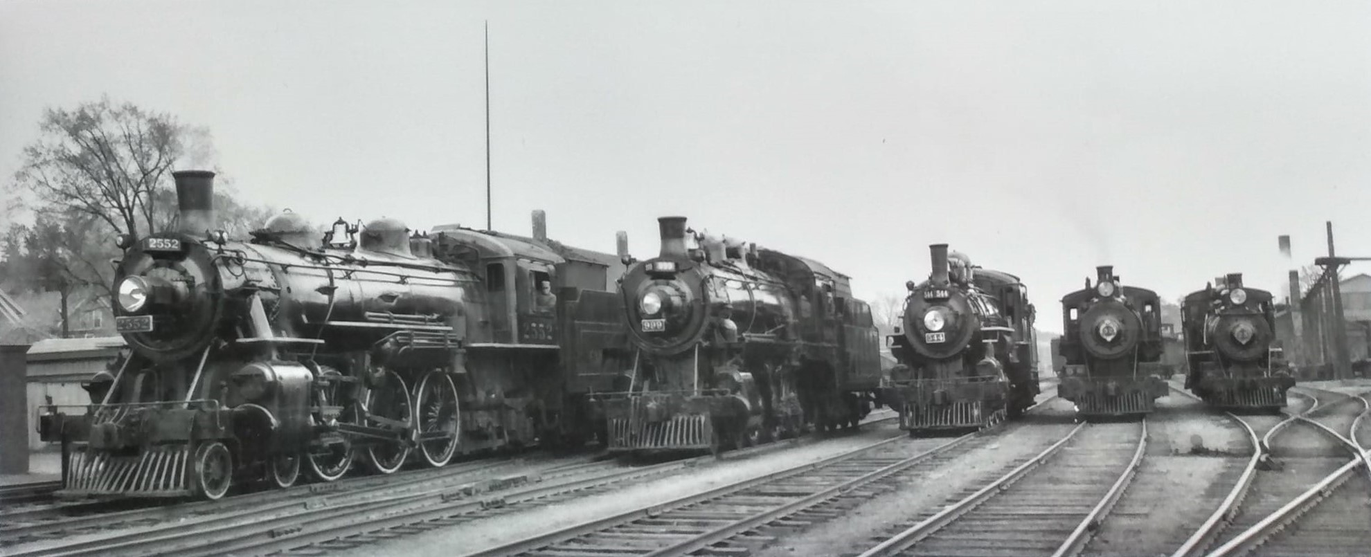 This photograph was one of a pair taken at the Kentville Railyard on May 14, 1937 by Edson Graham to mark the arrival of the first Pacific and first D10 locomotives.[1] It shows, in one dramatic view, the range of steam locomotives on the DAR from the big Pacific 4-6-2 to the little American 4-4-0. The locomotives from left to right are No. 2552 "Haliburton", No. 999 "Fronsac", No. 544 "Hebert", No. 32 "Blomidon" and No. 25 "Strathcona/Pontgrave". The photograph was carefully posed in the Kentville Railyard looking west to provide a head-on view. Note the flagpole of the Kentville Freight Shed visible and that the newly arrived locomotives 2552 and 999 had not yet been painted in DAR colours. It is one of two photographs taken from slightly different angles that day. Here is the other: Gary Ness Collection, 5_loco.jpg
