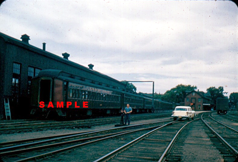 Original Kodachrome Slide. Kentville Railyard with inspection car, passenger car and Kentville Station in background in August of 1959.