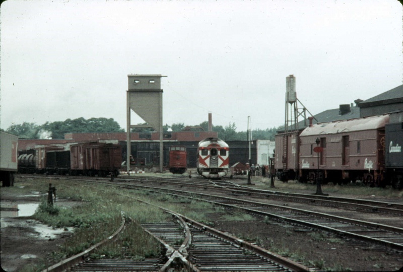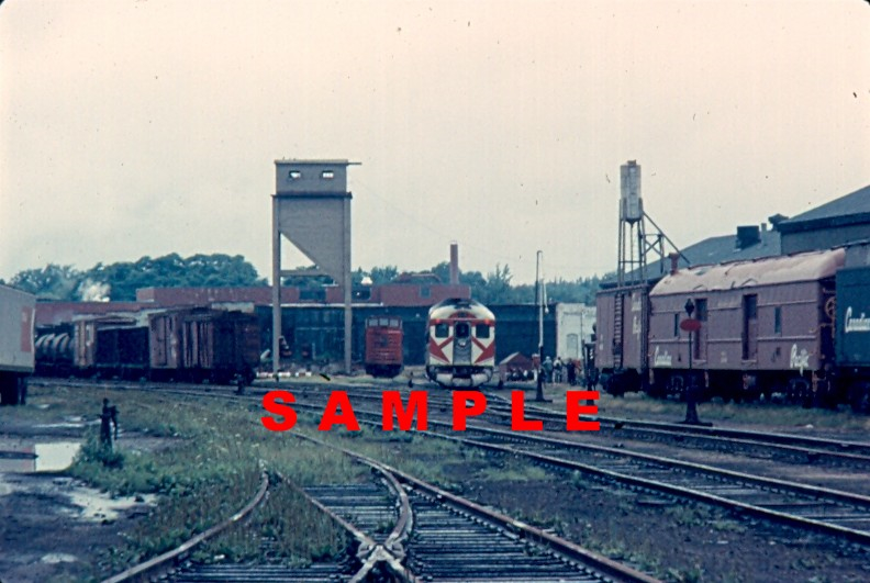 Original GAF Slide, August 1973, Dominion Atlantic Dayliner No. 9057 and Kentville Railyard, Kentville, NS. The burned ruins of the Kentville Machine Shop which burned earlier in 1973 can be seen through the legs of the coal tower.