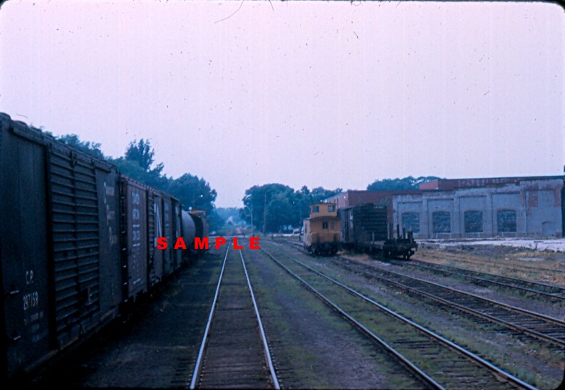 Kentville Railyard looking west, mainline at centre, freight on the south 1 yard track to right, south yard tracks and Kentville Roundhouse to right, 1975.