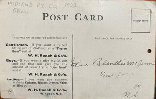 The post card was printed by W. H. Roach & Company, a mens and women’s clothing store in Windsor.