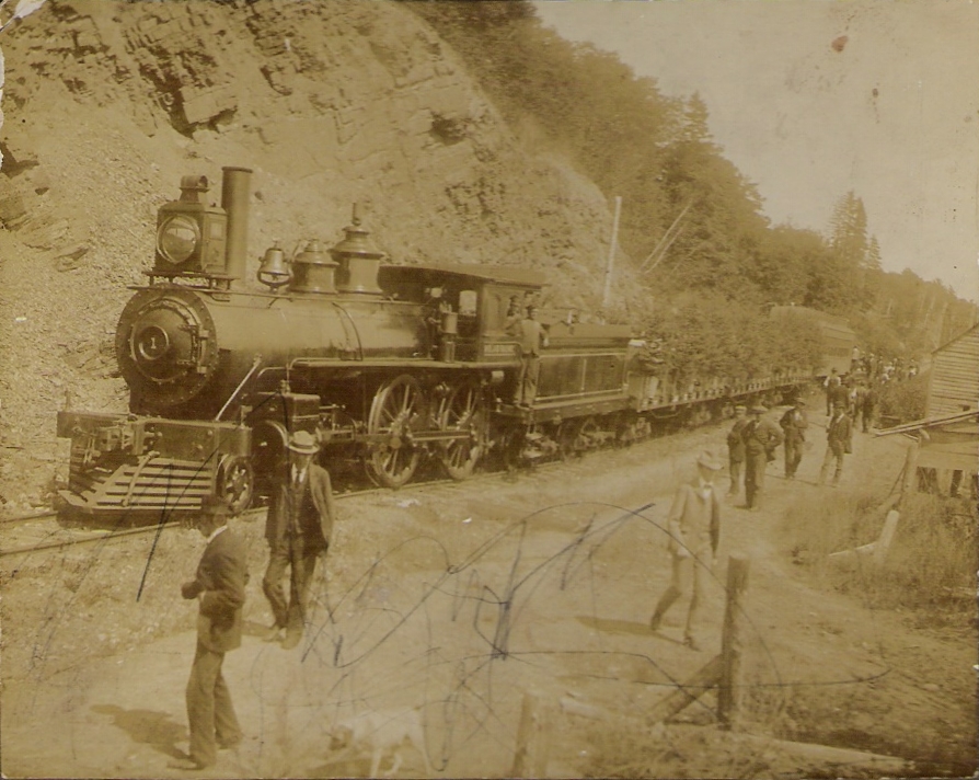 Construction photo of the work train at the South Maitland Bridge over the Shubenacadie River site. Engine No. 1 has "Midland" on side of cab.