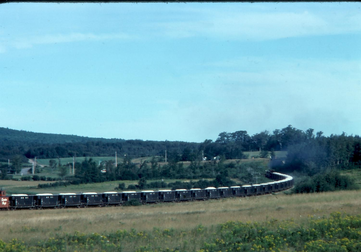 Original Kodachrome Slide, August 17, 1977. Canadian Pacific plaster train climbing out of Avon River Valley, Falmouth, NS.