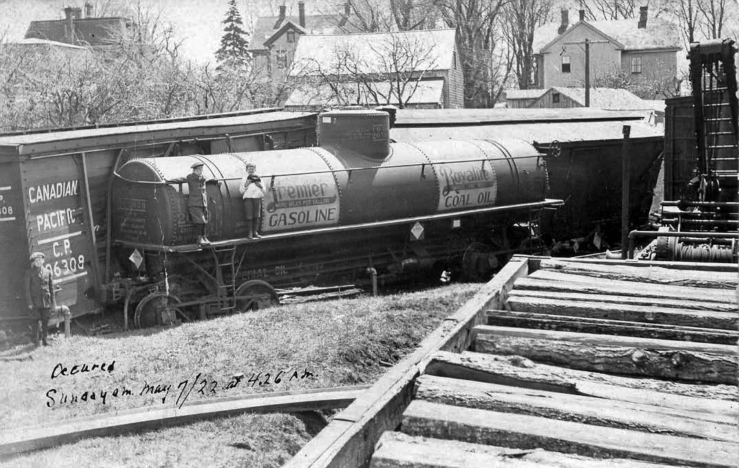 Derailment in Annapolis Royal Railyard on May 7, 1922. Visible is box car No. 106308 and a fine example of an early private tank car, Imperial Oil car IOX2058, probably intended for Annapolis Royal's Imperial Oil Bulk Plant.