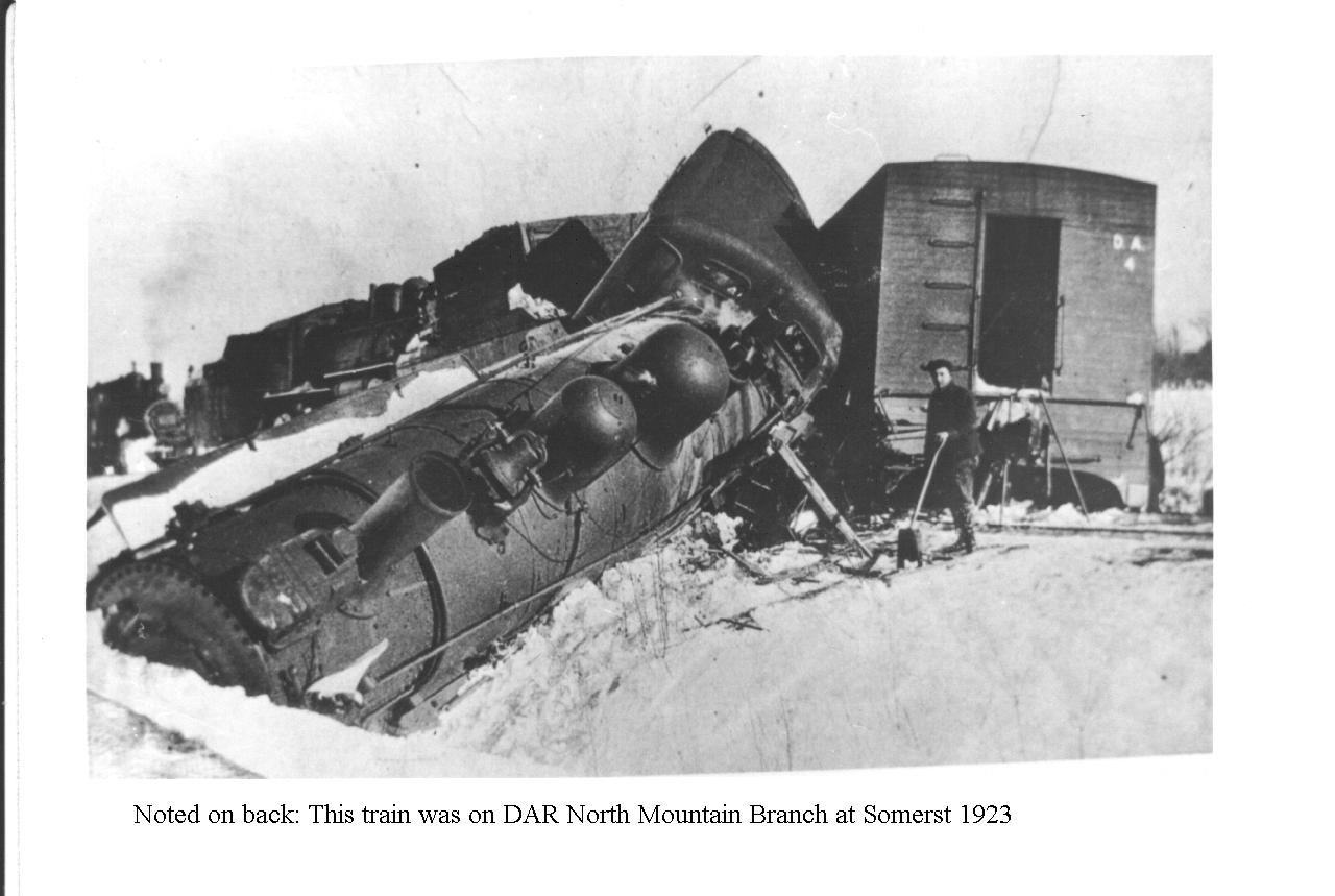 A note on the back of one print of this photo reads: "This train was on DAR Line North Mountain Branch at Somerset 1923". According to a Berwick Register article on Mar. 28, 1989, this photo was taken in January 1923 by T. M. Morton of Somerset. Morton told the Register the snow plow extra was westbound when a massive drift knocked the plow and engine sideways. One of the engine crew was badly scalded. Morton was paid to help shovel the locomotive out.