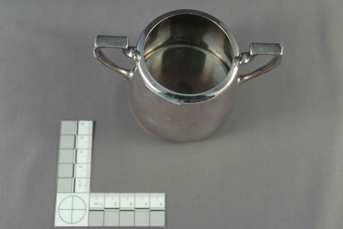 DESCRIPTION: Small silver-plated sugar bowl with 2 square-looped handles (one on each side). On one side of the bowl the initials "DAR" are written in fancy lettering. The sugar bowl has a circular base with the makers information on the bottom.